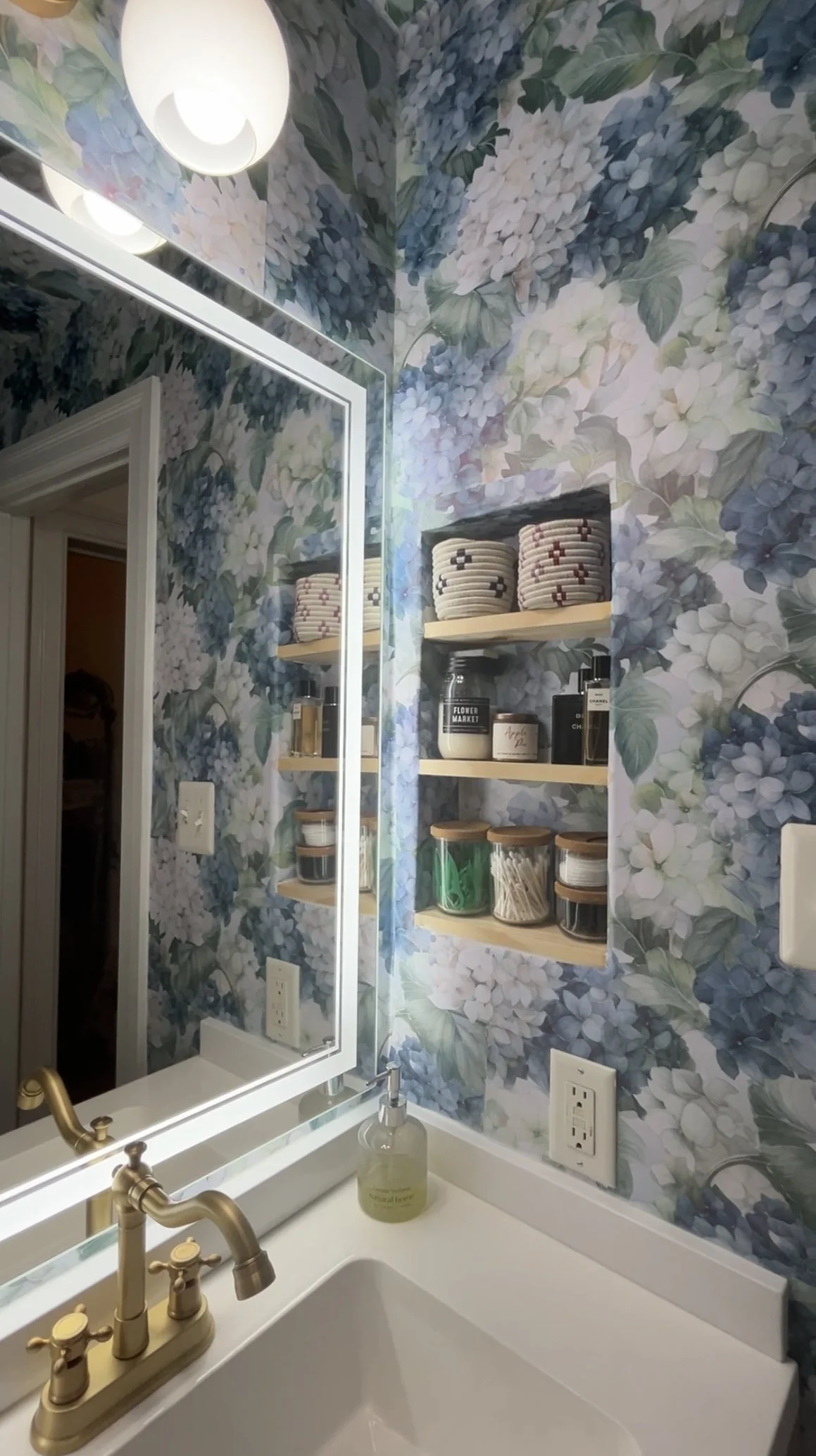 Who says bathrooms can’t be both functional and fun? This bathroom needed some SERIOUS work. After purchasing this home I discovered almost no storage, a terribly DIYd vanity, faulty plumbing and no junction box (hello, fire risk!). First up was adding storage every inch possible - creating an inset shelf next to the vanity for easy access, tripling vanity storage, and adding a large yet slim cabinet over the toilet which took this from scary to functional, with room to spare! I then redid the plumbing and installed safe electrical junction boxes.